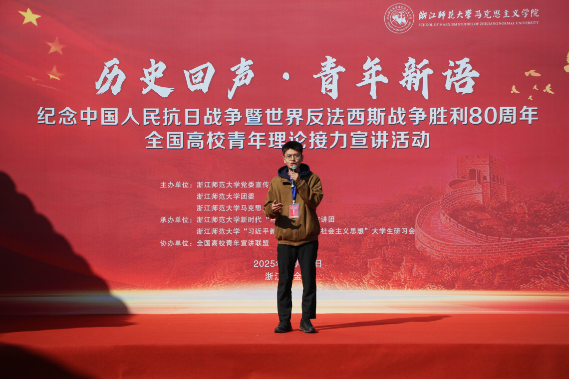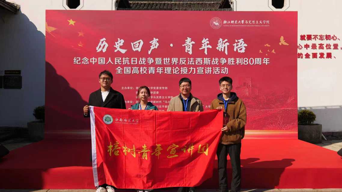 11月20日,在学校团委指导下,我校榕树青年宣讲团受邀参加由浙江师范大学主办、全国高校青年宣讲联盟协办的“历史回声·青年新语”——纪念中国人民抗日战争暨世界反法西斯战争胜利80周年全国高校青年理论接力宣讲活动。该活动在浙江省义乌市陈望道故居举行,活动现场气氛热烈,我校榕树青年宣讲团成员与来自中国人民大学、东南大学、西安交通大学等兄弟院校的青年宣讲代表同台交流,用青春之声讲好中国故事、用青年话语传播党的好声音,用青春力量践行党的新使命。