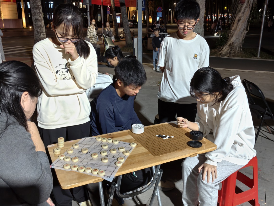 在龙昆南校区椰林广场,博雅棋社举办的“方寸之间,‘棋’乐无穷”对弈活动吸引了众多同学。棋手们凝神对弈、落子从容,在棋盘方寸间展现思维的碰撞与沉静的风度,引来不少同学驻足观看。同期,I say 爱说英语协会开展了“Daily Talk in a Minute!”英语口语互动活动,围绕日常话题营造沉浸式交流氛围,同学们在轻松对话中锻炼表达能力,感受语言学习的乐趣。此外,晴天文社于桂林洋校区天文馆组织了“双子星语,璀璨之约”流星雨观测活动。在远离城市光干扰的夜空下,同学们共同观测双子座流星雨,亲身感受这一天文现象,进一步激发了对宇宙的好奇与思考。