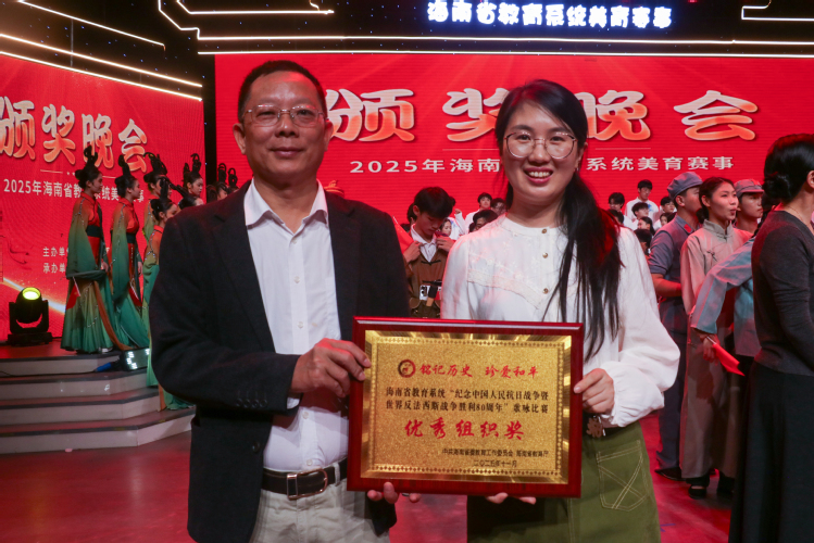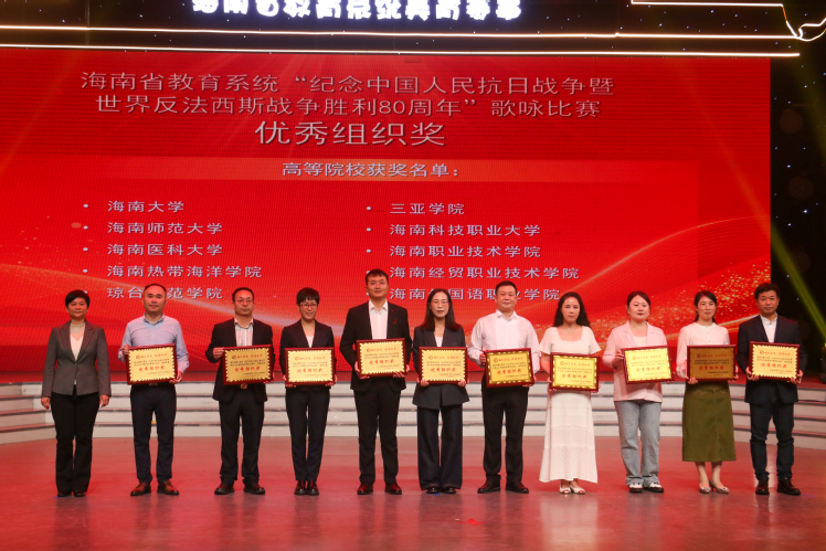 近期,由中共海南省委教育工作委员会、海南省教育厅主办的“纪念中国人民抗日战争暨世界反法西斯战争胜利80周年”歌咏比赛颁奖晚会在海口市融媒体中心落下帷幕。我校共选送专业组及非专业组合唱、表演唱、独唱6件作品代表学校参赛。经激烈角逐,音乐学院大合唱作品《天安门太阳的广场》+《旗正飘飘》、表演唱作品《怎么办,怎么办》(选自歌剧《沂蒙山》)、独唱作品《再看一眼亲人》均获专业组一等奖,初等教育学院表演唱作品《新编铁道游击队组曲》、化学与化工学院独唱作品《英雄赞歌》获非专业组二等奖,初等教育学院大合唱作品《南泥湾》获非专业组三等奖;表演唱作品《怎么办,怎么办》还受邀在颁奖晚会现场演出;学校获评“优秀组织奖”。