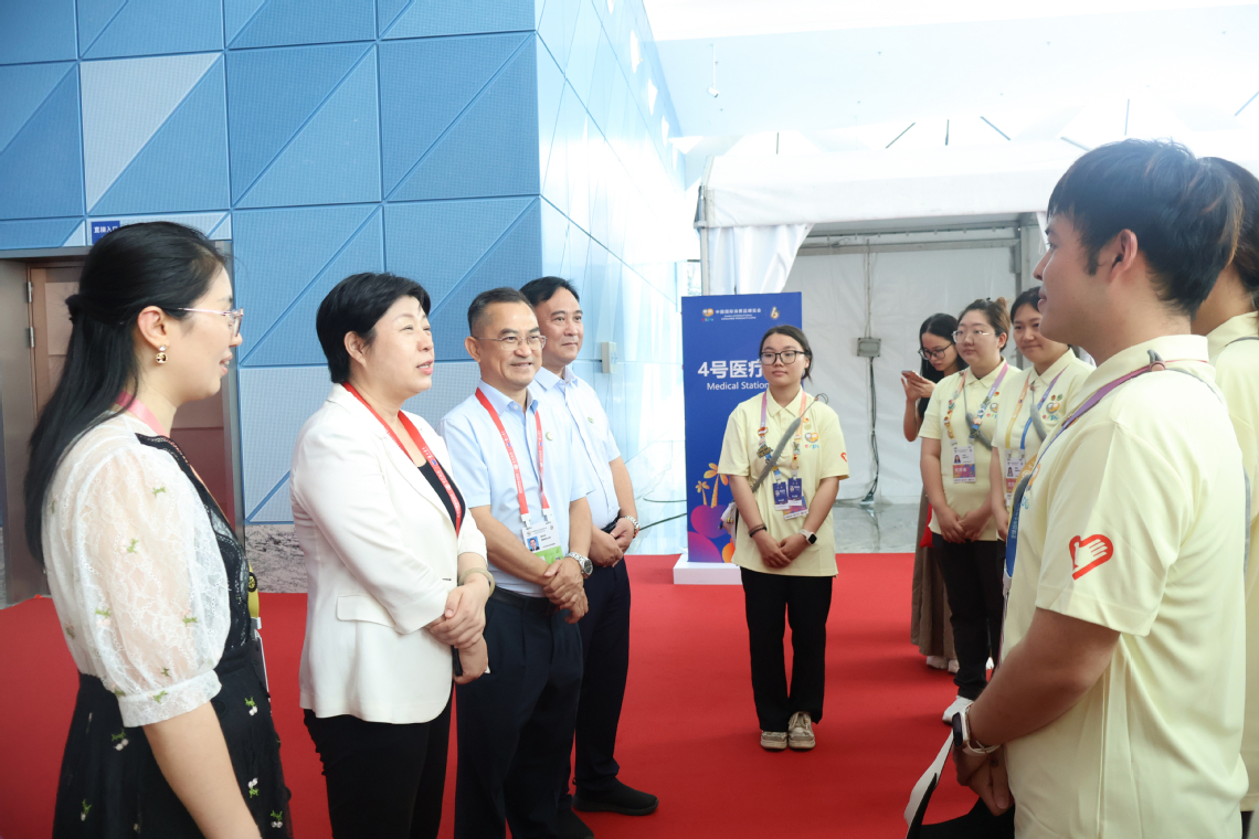 在各服务点位,许玫与志愿者们亲切交流,代表学校向坚守岗位、辛勤服务的全体“小椰青”致以诚挚问候和衷心感谢。她对大家以饱满热情投身服务,以严谨态度履职尽责的表现给予充分肯定,希望全体志愿者牢记初心使命,珍惜服务重大国际展会的宝贵历练机会,在实践中增长才干、锤炼品格。严守工作纪律,规范服务流程,以专业素养和良好的精神风貌展现海师学子的责任担当,圆满完成各项服务任务。同时,她特别叮嘱户外岗位志愿者做好防暑降温、注意劳逸结合,切实保障自身健康安全。